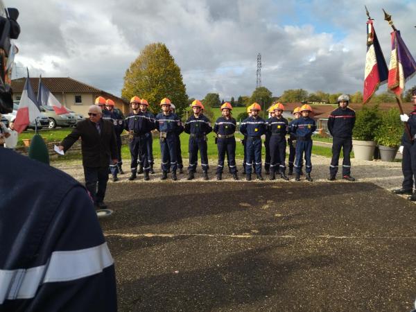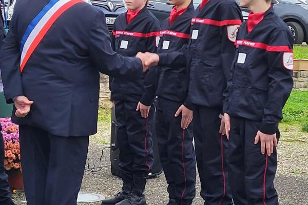 La promo de jeunes sapeurs-pompiers au garde-à-vous en ce 11 Novembre : sous le regard ému de leurs proches, les jeunes ont reçu des écussons lors de la cérémonie commémorative devant le monument aux morts.