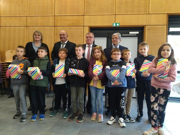 Dès la fin de la cérémonie Noël Piroux a invité élus, officiels, familles et enseignants à se retrouver dans la salle des fêtes "Clair-Matin" pour la traditionnelle remise des dictionnaires aux petits élèves de CM1 du Regroupement pédagogique intercommunal. Les dix élèves ont été encouragés par leurs aînés, ils pourront désormais apprendre à utiliser et à maîtriser cet outil indispensable qui leur sera très utile pour la poursuite de leur scolarité en primaire puis en collège.