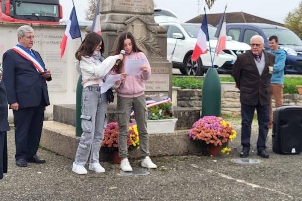 Deux collégiennes de Pirajoux se sont chargées de lire le message de l'UFAC (union française des anciens combattants et de victimes de guerre)